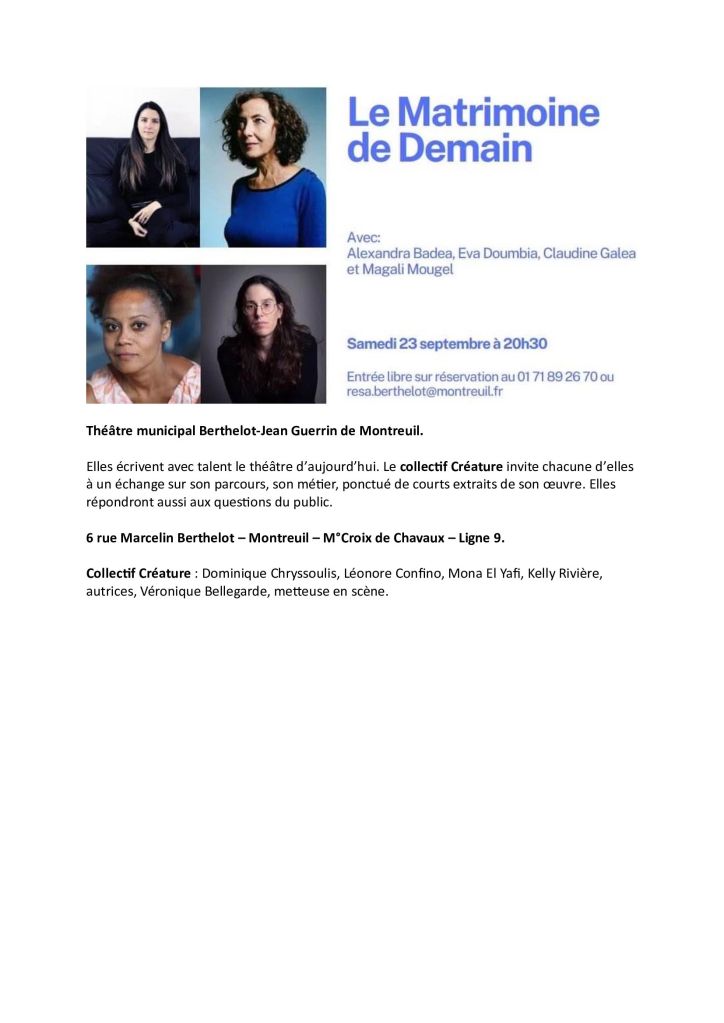 Elles écrivent avec talent le théâtre d’aujourd’hui. Le collectif Créature invite chacune d’elles à un échange sur son parcours, son métier, ponctué de cours extraits de son œuvre. Elles répondront aussi aux questions du public.