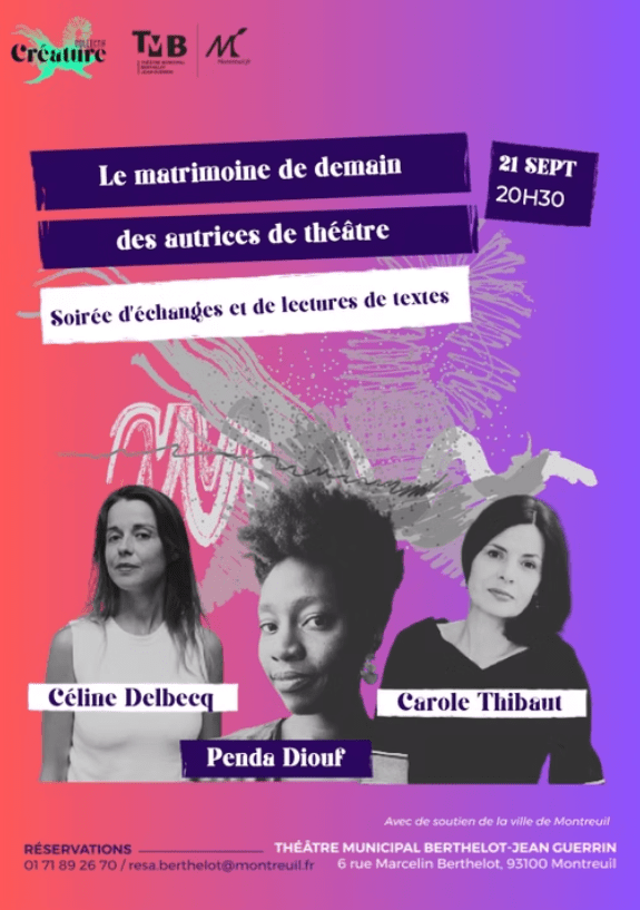 Dans le cadre des Journées du Matrimoine organisées par la ville de Montreuil, le Collectif Créature présente sa quatrième édition du Matrimoine de demain des autrices de théâtre. Pour que leurs œuvres irriguent le futur comme elles marquent notre époque, les autrices du collectif mettent cette année en lumière Céline Delbecq, Penda Diouf et Carole Thibaut. L’occasion d’entendre des extraits de leurs textes et de les interroger individuellement sur leur parcours, leur métier et leur écriture avant de les inviter à répondre aux questions du public.